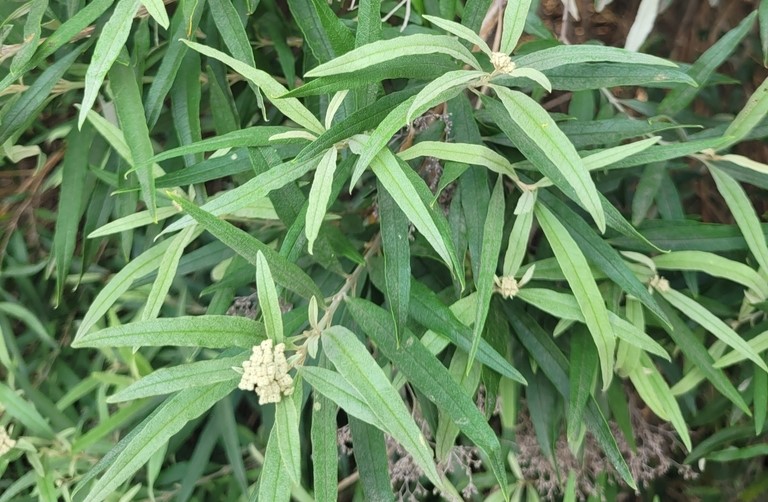 The leaves are long, narrow, and dark green above with a whitish, textured underside.