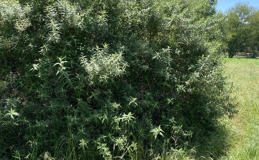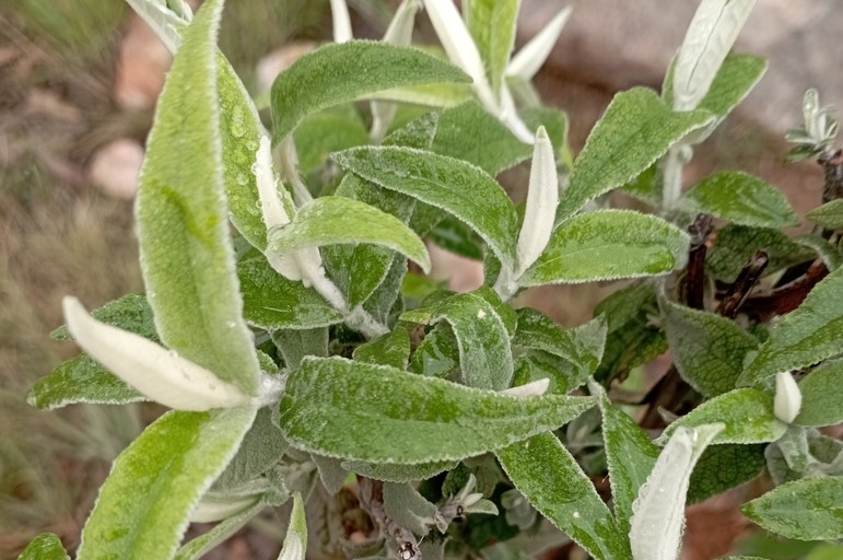 Large, semi-evergreen shrub or small tree, multi-stemmed with untidy, drooping branches. Height typically 4 – 8 m. Leaves opposite, lanceolate, dark green and conspicuously wrinkled above, densely hairy beneath.