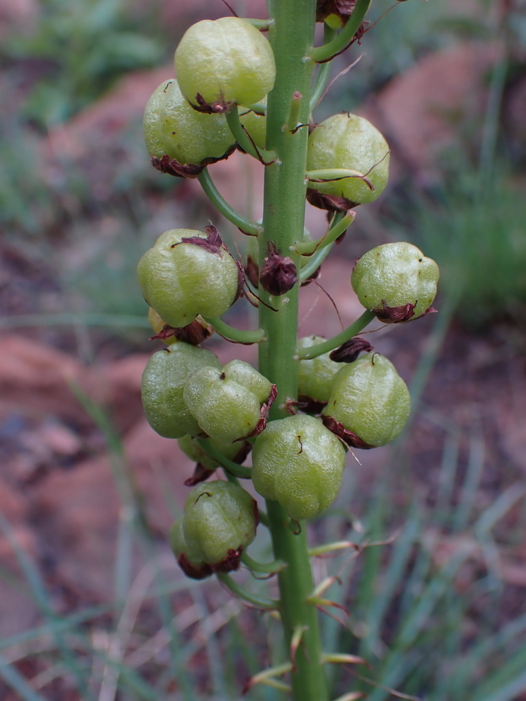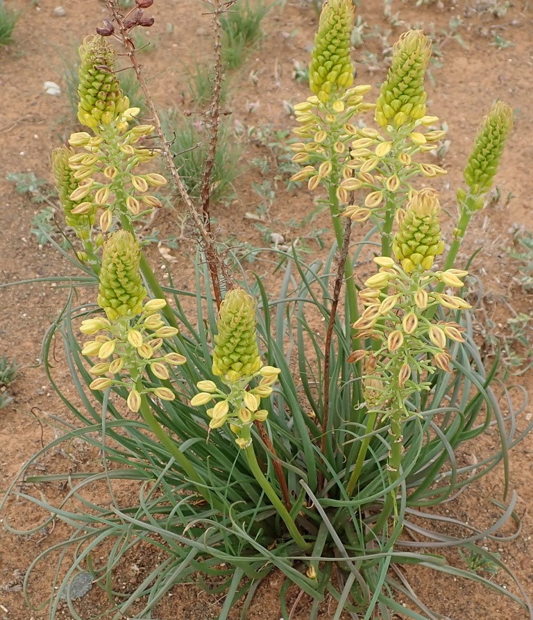 The plant produces star-shaped, bright yellow flowers with bearded stamens on long, slender stalks, mainly in spring and summer, but may flower throughout the year in cultivation. The inflorescence is a dense, many-flowered spike that can reach up to 80 cm tall.