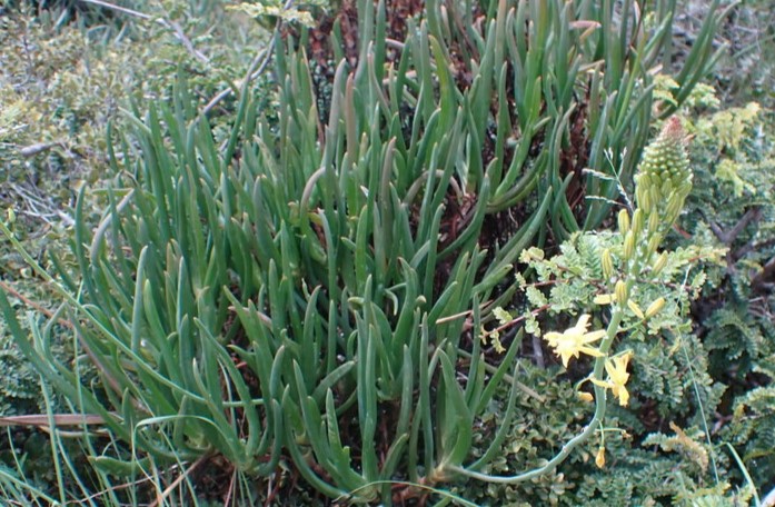 Bulbine frutescens is a fast-growing, succulent perennial with fleshy, linear green leaves arranged in opposite rows, forming spreading clumps.