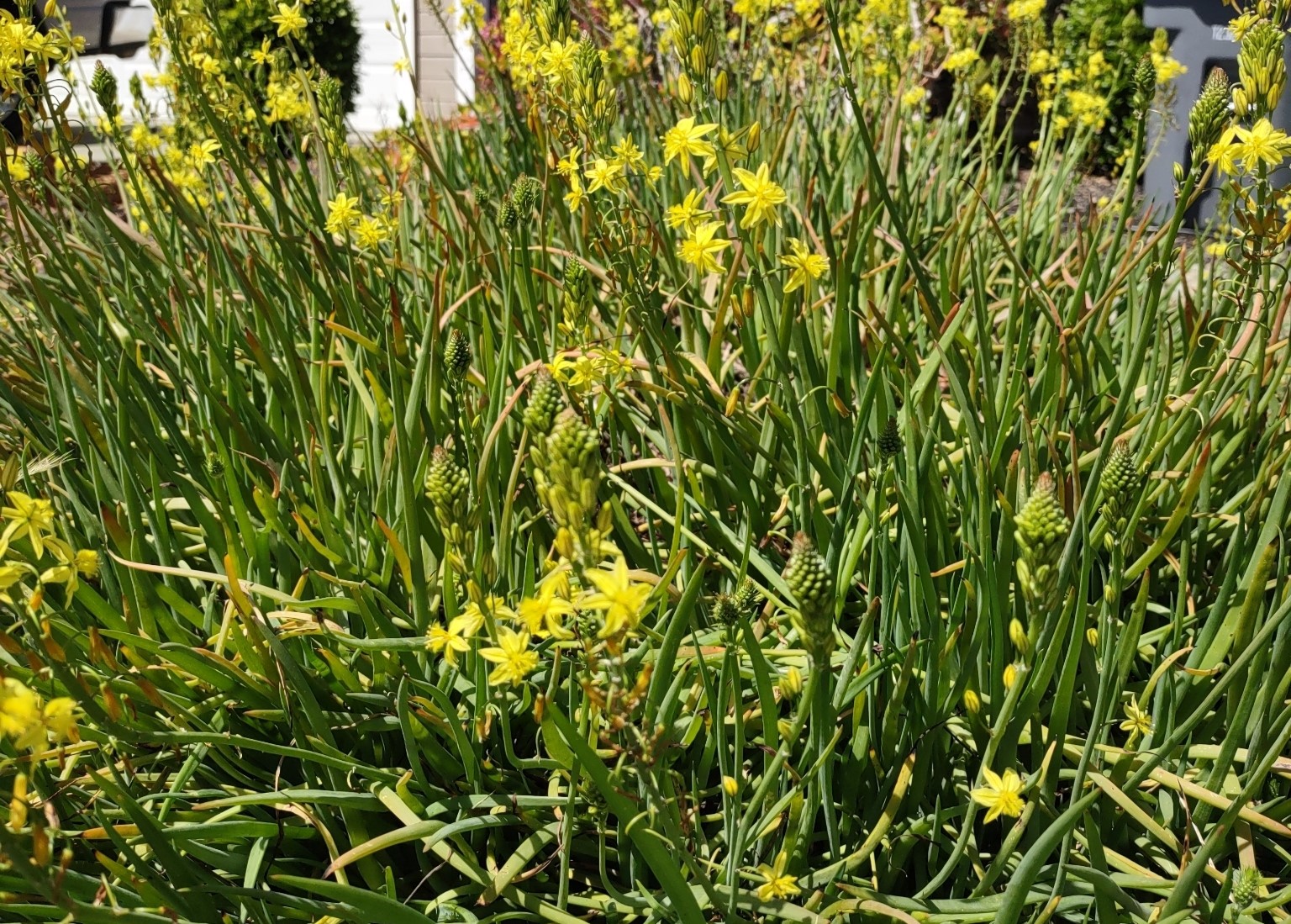 It produces upright, branched stems with small, star-shaped yellow or orange flowers carried in racemes above the foliage, mainly in spring and summer.