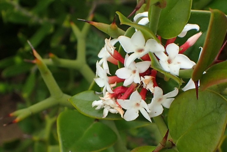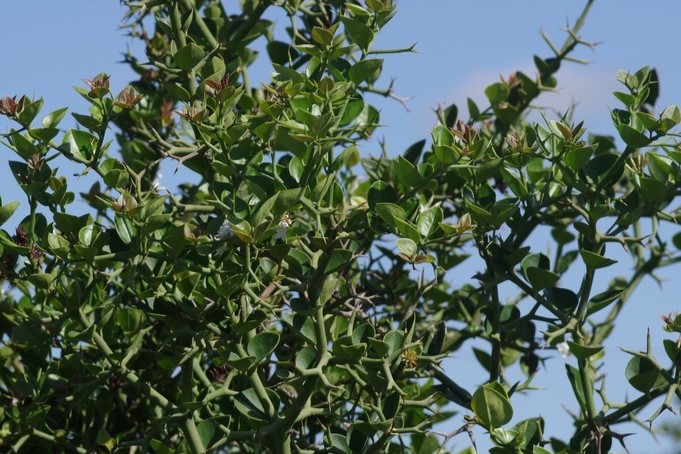 Evergreen dense shrub or small tree with twiggy branches and milky sap.