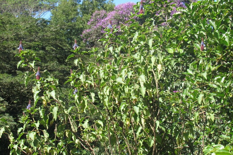 The plant produces dense spikes of mauve to dark blue flowers in late autumn to winter.