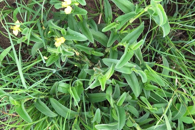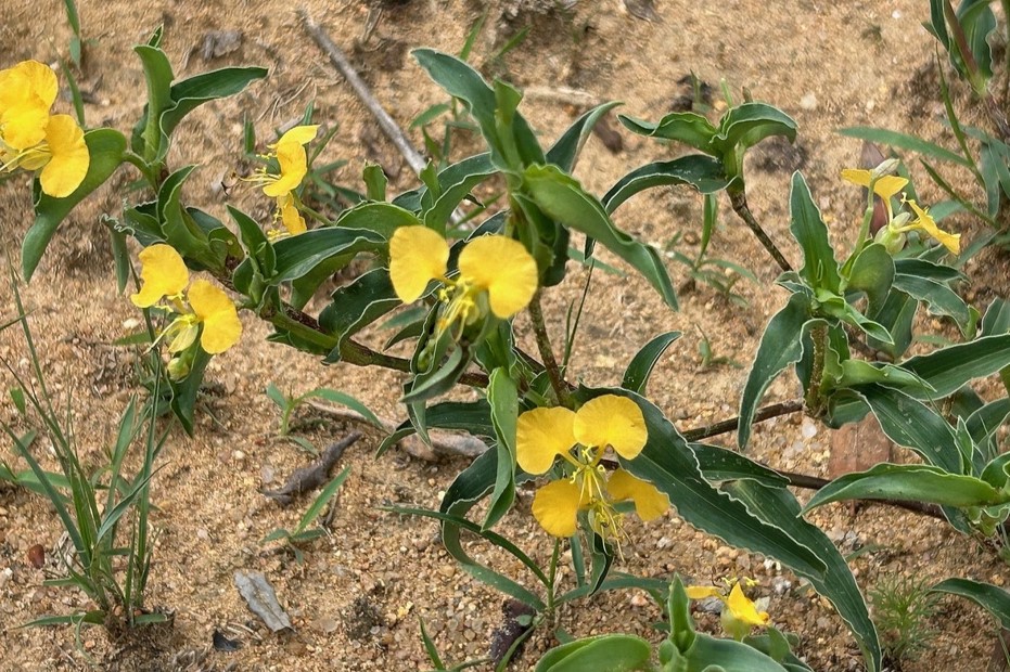 Commelina africana is variable, spreading, prostrate perennial herb, often rooting at the stem nodes.
