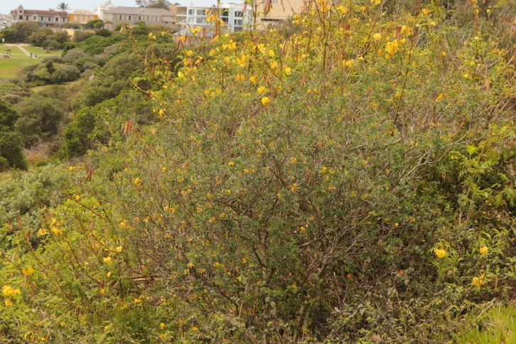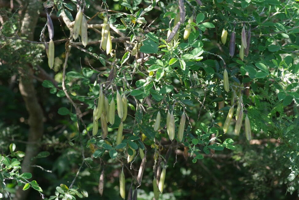 Crotalaria capensis is a much-branched, upright shrub or small tree, reaching heights of 2–5 meters. It has slender stems with drooping branches and bright green trifoliate leaves with silvery young growth. Large, striking pea-shaped flowers, bright yellow often edged with red, are borne in pendulous sprays from October to April, though blooms may appear year-round. After flowering, inflated light-brown pods develop (January – June). The pods make a distinctive rattling sound when dry, giving rise to its common name. The plant is visually prominent in the landscape due to its golden flowers and substantial growth, often forming stands on forest margins and disturbed areas.