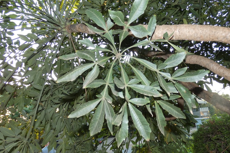 Cussonia spicata, the spiked or common cabbage tree, is a fast-growing, evergreen African tree supporting significant Lepidoptera diversity—including large emperor moths and Charaxes butterflies. A medium to large tree (typically up to 15 m in height) with a thick, corky trunk and distinctive large, shiny, twice-compound leaves clustered at branch tips. The rounded crown makes it and attractive feature tree for landscaping. Flowers are greenish, borne on upright, candle-like spikes from April to June. The black fruits that ripen soon there after, are relished by birds.