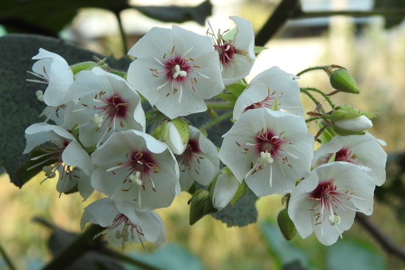 Velvety buds open to white flowers with deep pink centers (Dec – May), in hairy-stalked bunches in upper leaf axils.