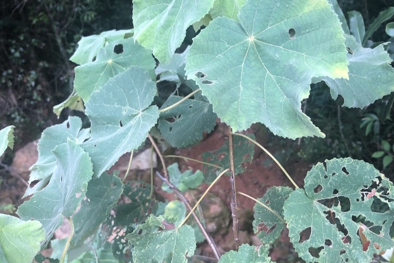 Leaves roundish to triangular, 4 – 20 cm, velvety above and silvery or greyish white beneath, with roundly toothed margins and 5 – 7 prominent veins.