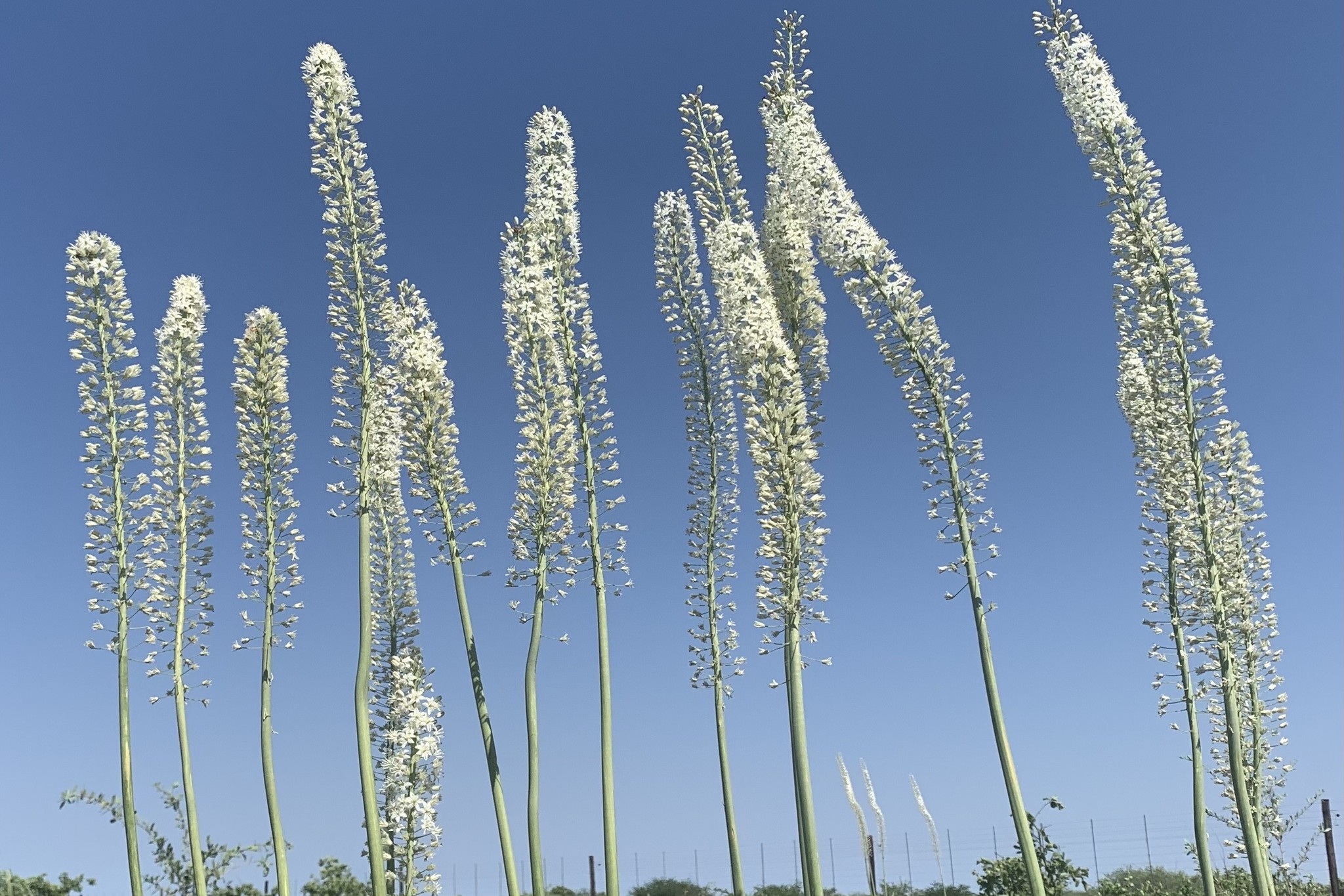 Small, white flowers densely packed on tall stem, pollinated by insects; seeds wind-dispersed.