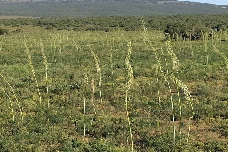 Perennial, deciduous, bulbous plant with large bulbs and a tall flowering stem (35 – 200 cm). After flowering, a rosette of leaves (20 – 50 cm long) emerges. Flowers are small, white, densely packed on the tall stem. Bulb is often partly above ground.