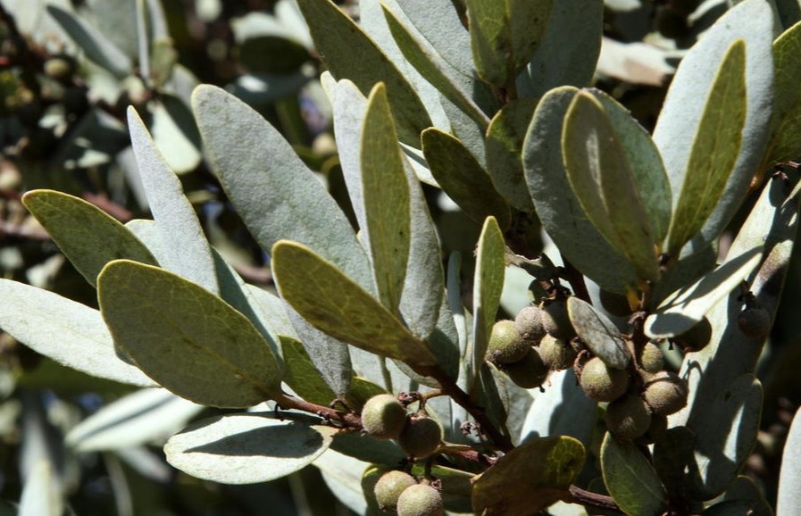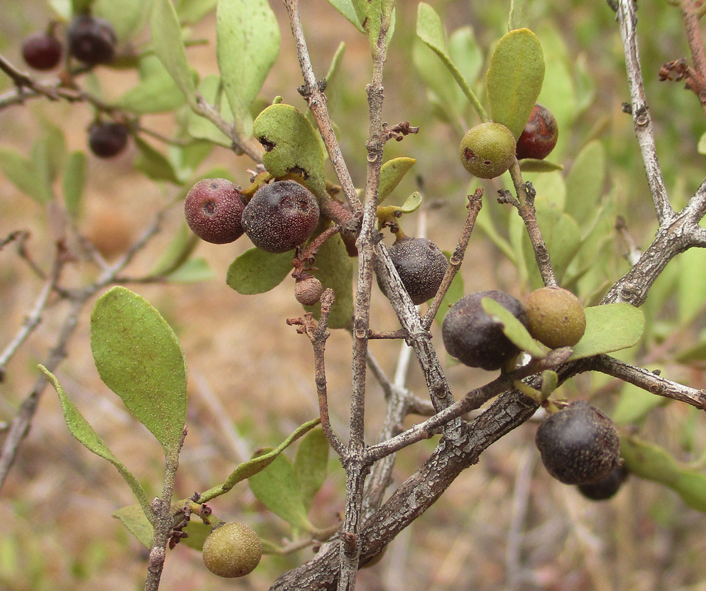 Evergreen shrub or small tree with dense, rounded crown. Leaves simple, ovate, leathery, dark blue-green. Flowers small, greenish, fragrant, in clusters. Fruits small, black berries. Important for wildlife food and shelter.