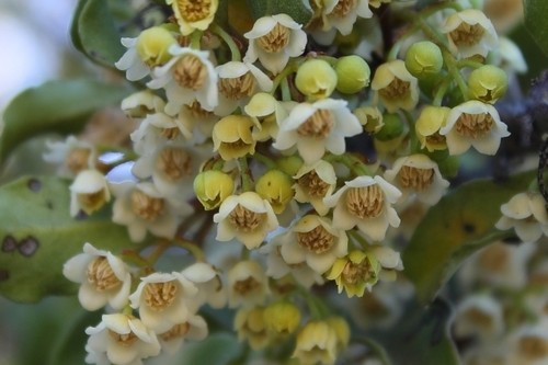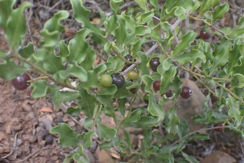 Evergreen shrub or small tree with dense rounded crown. Leaves simple, ovate to elliptic, dark green above, paler beneath, with undulate margins. Flowers small, greenish, fragrant. Fruits small, black berries. Important for wildlife.