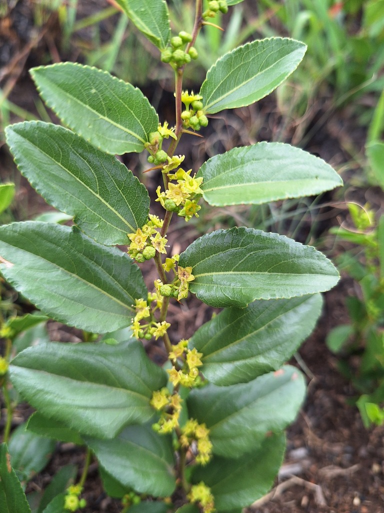 Tree (3 – 10 m) with zigzag branches, paired thorns, and yellow-brown fruits. Culturally significant; drought-hardy.